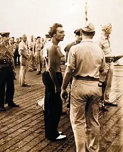 Fünf Tage später trafen die drei Boote 2.000 km östlich von Natal zusammen. U 604 übergab Proviant und Treibstoff an U 185 und wurde gerade zum Versenken vorbereitet, als ein US-amerikanischer B 24-Bomber angriff. Es handelte sich um dieselbe Maschine, die U 604 bereits am 3. August schwer beschädigt hatte. Während Carl Emmermann, Kommandant von U 172, sich entschied, tauchen zu lassen, ließ Kommandant Maus die Artillerie von U 185 das Feuer auf den Bomber eröffnen, der kurze Zeit später ins Wasser stürzte, wobei alle 10 Besatzungsmitglieder ums Leben kamen. Einige Tage später traf U 185 wieder mit U 172 zusammen und übergab etwa die Hälfte der Besatzung von U 604, das inzwischen planmäßig selbstversenkt worden war. August Maus stellte Carl Emmermann wegen seiner Entscheidung, sein U-Boot beim Angriff der B 24 tauchen zu lassen, zur Rede. Emmermann begründete seine Handlungen damit, dass der Beschuss des Bombers eines seiner Besatzungsmitglieder getötet habe und außerdem seine Geschütze nicht einsatzbereit gewesen wären. Um die Rückreise nach Nordfrankreich zu ermöglichen, wurden die beiden Boote zu einem Treffen mit dem Versorgungsboot U 847 beordert, um Treibstoff nachzutanken. U 172 traf zuerst ein. Die Brückenwache des Versorgungsbootes und die Sicherungsmaßnahmen, die dessen Kommandant Herbert Kuppisch ergriffen hatte, machten auf Emmermann einen so schlechten Eindruck, dass er Kuppisch deswegen zur Rede stellte.[9] Als U 185 am 24. August beim Treffpunkt eintraf, war U 172 bereits wieder verschwunden. Auf der Suche nach U 847 wurde U 185 von einem Wildcat-Jäger und einem Avenger-Torpedoflugzeug des Flugzeugträgers USS Core attackiert. Die Salve der Wildcat setzte die Brückenwache außer Gefecht und tötete den Zweiten Wachoffizier des Bootes. Die Wasserbomben der Avenger beschädigten den Rumpf und bewirkten das Austreten von Chlorgas, wodurch mehrere U-Boot-Fahrer innerhalb kürzester Zeit starben. Als sich das Chlor ausbreitete, erschoss der ehemalige Kommandant von U 604, Horst Höltring, auf deren Bitten hin zwei schwer verwundete Seeleute – darunter einen nicht mehr gehfähigen Mann von U 185 mit einer schlimmen Schusswunde am Bein – im Bugtorpedoraum von U 185 und anschließend sich selbst.[10][11] Angesichts der Schäden befahl Kommandant Maus, die Tauchretter anzulegen, das Boot zu verlassen und selbstzuversenken. Als ein großer Teil der Besatzung an Deck stand, griff das Avenger-Flugzeug erneut an und richtete so nach Worten von Maus „ein Blutbad“ an.[12] Nach dem US-amerikanischen Bericht feuerte das Flugzeug dagegen nicht (mehr) auf die Männer an Deck, da sie das sinkende Boot verließen.[10] Der Zerstörer Barker, der zur Sicherung der Core gehörte, rettete wenig später 36 U-Boot-Fahrer aus dem Wasser, darunter neun Besatzungsmitglieder von U 604, und überstellte sie dann auf die Core. Der Leitende Ingenieur Oberleutnant (Ing.) Herbert Ackermann und der Schiffsarzt Oberassistenzarzt George Bamler von U 185 starben kurze Zeit später an Bord der Barker an den Folgen einer Chlorgasvergiftung. Zwei weitere U-Boot-Fahrer starben kurz darauf an Bord der Core, womit nur noch 32 Gefangene verblieben. Von den Offizieren von U 185 hatte letztendlich neben dem Kommandanten Maus nur der Erste Wachoffizier, Leutnant zur See Hans-Otto Rieve, überlebt. Infolge der Versenkung starben insgesamt 29 Besatzungsmitglieder von U 185 – einschließlich der an Bord der Barker und Core Gestorbenen – und 14 von U 604. 23 Besatzungsmitglieder von U 185 (ohne die an Bord der Barker und Core Gestorbenen) und 9 von U 604 gerieten in US-amerikanische Kriegsgefangenschaft.