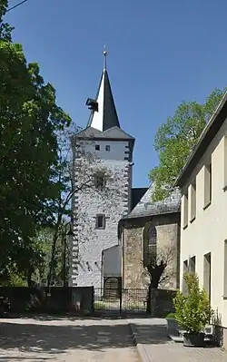 - Die evangelische St.-Kilian-Kirche ist ein stattlicher Bau, der vom früheren Wohlstand des Ortes zeugt. Der Turm weist wehrhafte Merkmale auf und stand ehemals frei, er könnte Teil einer Befestigungsanlage gewesen sein.[5] 1575 schenkte ein Erfurter Bürger der Kirche ein wertvolles Holzschnitzwerk "Die Anbetung der Heiligen Drei Könige". Das Kirchenschiff wurde 1592/94 neu gebaut. 1709 erhielt die Kirche eine Orgel des berühmten Orgelbauers Georg Christoph Stertzing. 1721 wurde Tobias Friedrich Bach (1695–1768, Sohn von Johann Christoph Bach aus der berühmten Musikerfamilie) Kantor und Organist. 1817 stifteten Bürger ihrer Kirche das Gemälde "Luther auf dem Reichstag zu Worms" des Weimarer Malers Ferdinand Jagemann. 1928 wurde eine neue Orgel eingebaut.
