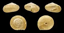 Das kugelförmige Gehäuse misst 4,5 bis 5 mm in der Höhe und 6 bis 8 mm in der Breite. Es hat 4,5 bis 5 gewölbte Windungen, die durch eine flache Naht voneinander getrennt sind. Die Außenlinie des Gewindes ist leicht konvex gewölbt. Die Mündung ist im Querschnitt abgeflacht elliptisch bis quer-eiförmig. Es ist keine Lippe an der Innenseite des Mundrandes vorhanden. Der Mundrand läuft scharf aus und ist von der Basis hin zum Spindelbereich zunehmend umgeschlagen. Der Nabel ist eng und wird teilweise vom umgeschlagenen Mundrand verdeckt.