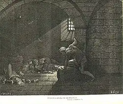Laut Dante starben die Gefangenen im Turm langsam am Hunger, und bevor sie starben, baten Ugolinos Kinder ihren Vater, er solle ihre Körper essen. Ugolinos Erzählung endet mit dem doppeldeutigen Satz: „Dann war der Hunger stärker als die Trauer“ (più che il dolor poté il digiuno),[3] der sich auf zwei Weisen interpretieren lässt: Entweder will Ugolino sagen, dass er aus Hunger die Leichen seiner Kinder aß, oder er meint nur, dass er an Hunger starb, weil er nicht aus Trauer sterben konnte. Die erste, grauenhaftere These ist die populärere und am weitesten verbreitete. Von daher verbindet sich mit der Gestalt Ugolinos der Vorwurf des Kannibalismus. Auch die Tatsache, dass Dante Ugolino am Schädel Ruggieris nagen lässt, spielt darauf an. In der bildenden Kunst wird er nach einem Vers Dantes oft dargestellt, wie er verzweifelt in die eigenen Hände beißt („Ich biss vor Jammer mich in beide Hände“ / „ambo le man per lo dolor mi morsi“, Inferno XXXIII, 57), so zum Beispiel in Auguste Rodins Skulptur Das Höllentor und in Ugolino und seine Söhne von Jean-Baptiste Carpeaux.