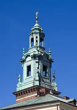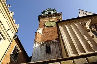 Der Uhrturm brannte im 14. Jahrhundert ab, erhalten blieben jedoch die Fundamente aus Kalkstein. Daraufhin wurde der obere Teil im Stil der Backsteingotik unter König Kasimir dem Großen wieder aufgebaut. Der Bau wurde nach dem Tod des Königs zunächst eingestellt und bis 1522 vom Domherrn Jan Salomonowicz zu Ende gebracht. 1677 wurde der Turm von Bischof Andrzej Trzebicki weiter erhöht und mit einem Turmhelm mit zwölf goldenen Schwänen gekrönt. Der Turmhelm wurde 1703 bei einem Sturm zerstört und fiel auf das Dach des Kirchenschiffs, das er ebenfalls beschädigte. Bischof Kazimierz Łubieński ließ den Turmhelm von Kacper Bażanka in den Jahren 1715–1716 rekonstruieren. Am Turmhelm wurden vier Heiligenstatuten aufgestellt: Kasimir, Wenzel, Stanislaus und Adalbert. Im Erdgeschoss des Turms befindet sich die Grabkapelle de Czartoryski sowie der Eingang zu den Königskrypten.
