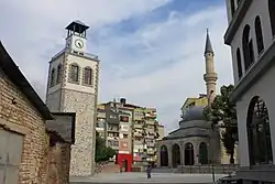 Der Vorgängerturm wurde im Jahr 1784 nach einer Vereinbarung zwischen moslemischen Gegen aus der Region Dibra und orthodoxen Bewohnern von Voskopoja (Voskopoja war eine Hochburg der Aromunen in Albanien) errichtet. Er gehörte zum Komplex der 1490 errichteten Mirahor-Moschee, eines Bauwerks, das von Iliaz Mirahor Beu, Veteran der Eroberung von Konstantinopel durch Fatih Sultan Mehmet im Jahr 1453, erbaut wurde. Die Turmglocken waren bis zum nahegelegenen Alten Basar hörbar. 1893 wurden die Glocken durch eine Uhr ersetzt. 1931 wurde der Uhrturm während eines Erdbebens beschädigt und 1933 von der Stadt restauriert, wobei die Fenster im oberen Bereich des Turms zubetoniert wurden.