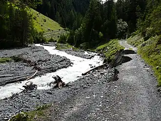![]() Die Uina mit unterspülter Strasse im Val d’Uina | ||