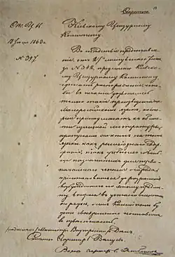 1876 sprach Zar Alexander II. in Bad Ems auf Betreiben der zaristischen Zensurbehörde ein weitreichendes Verbot ukrainischsprachiger Publikationen aus (Emser Erlass) mit der Begründung, dass „es keine spezielle kleinrussische Sprache gab, es nicht gibt und nicht geben kann“.[8] Bis zum 17. Oktoberjul. / 30. Oktober 1905greg., als das von Sergei Witte ausgearbeitete Oktobermanifest von Zar Nikolaus II. verkündet wurde, unterlagen ukrainische wissenschaftliche Publikationen, Lesungen, Ausstellungen und Konzerte diesem Diktat. Der bedeutendste ukrainische Dichter Taras Schewtschenko (1814–1861) wurde für seine Texte und Gedichte in die kasachische Verbannung geschickt.[9]