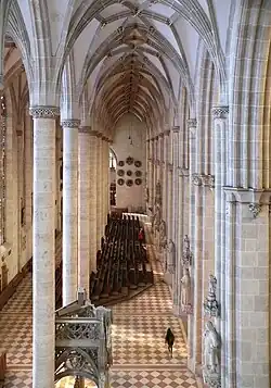 - Das 26,5 m hohe Sakramentshaus von 1467/1471, welches sich am linken Chorbogen befindet. Unter der Freitreppe sind die Figuren der Heiligen Sebastian und Christophorus. An der Geländerbrüstung sind sechs Statuetten von Päpsten und Bischöfen zu sehen.