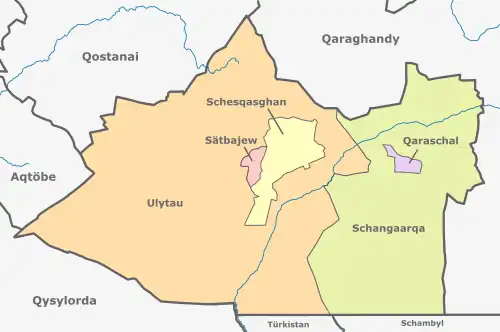 Das Gebiet ist in fünf Bezirke (kasachisch Аудан Audan; russisch Район Rajon) unterteilt. Das Verwaltungszentrum Schesqasghan und die Städte Qaraschal und Sätbajew stellen dabei jeweils einen eigenen Stadtkreis dar.