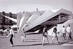 Eingangsgebäude und Flügelbauten sind als Stahlbeton-Skelettkonstruktion in Ortbetonbauweise ausgeführt. Neben den Wandscheiben werden die sechszügige Treppenanlage im Eingangspavillon und die Stützrampen der Flügelbauten zur Horizontalaussteifung genutzt. Die Decken sind als parallel orientierte Plattenbalkenkonstruktion (Spannweite 15 m) ausgebildet. Ein verziehbares Schalungssystem ermöglichte die effektive Herstellung der Decken. Das Zickzack-Faltwerk der Dachbereiche bildet mit den Auskragungen eine statisch-konstruktive Einheit. Die Faltung wird in den Auskragungen als Faltwerk-Kontinuum weitergeführt, wobei die Torsionsmomente an den Richtungsänderungen durch Querscheiben aufgenommen werden. Die räumliche Tragwirkung des Faltwerks ermöglichte es, die nur 7 bis 15 Zentimeter starken Stahlbetonfalten um 15 Meter nach oben und 21 Meter nach unten frei schwebend auskragen zu lassen. Für die Betonierung des Daches kam eine Spritzbetontechnologie (Torkret-Verfahren) zum Einsatz. Die Berechnung der Tragfähigkeit, der Schwingungsanfälligkeit und der Überhöhungskurve für den Schalungsbau erwiesen sich bei der statischen Berechnung der Kragdächer als besondere Herausforderungen.[6]