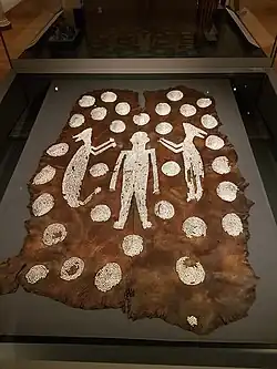 Die Schneckengehäuse auf dem Umhang sind in ursprünglich 34 Kreisen, zwei Tierfiguren und einer Darstellung eines Menschen angeordnet. Im Unterschied zu den Schneckengehäusen für die Kreise und die beiden Tierdarstellungen wurden die Gehäuse für die Figur des Menschen im Zentrum an zwei Seiten abgeschliffen, so dass sie deutlich kleiner als die übrigen sind. Das Geschlecht des im Zentrum dargestellten Menschen lässt sich nicht bestimmen. Die Figur ist jedoch mit den verfügbaren Mitteln detailliert ausgearbeitet, bis hin zu Daumen und großen Zehen, die von den übrigen Fingern und Zehen unterscheidbar sind. Die beiden Tierdarstellungen wirken auf den ersten Blick gleichartig. Die unterschiedliche Ausführung der Schwänze und Füße lässt jedoch erkennen, dass es sich um unterschiedliche Arten handelt: das linke Tier hat einen langen Schwanz und runde Pfoten mit fünf Zehen, während das rechte einen kurzen Schwanz und einfach gespaltene Hufe aufweist. Da der einzige in Virginia heimische Paarhufer der Weißwedelhirsch war, konnte aus dem Größenverhältnis der Darstellungen des Hirsches und des Menschen auch für das linke Tier die Größe geschätzt werden. Auf dieser Grundlage kommt nur ein Puma für die linke Darstellung in Frage.[2][4]