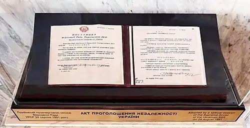 Nach dem gescheiterten Augustputsch in Moskau verabschiedete die Werchowna Rada, der ehemalige Oberste Sowjet der USSR, am 24. August 1991 die formelle Unabhängigkeitserklärung. Der Jurist und Bürgerrechtler Lewko Lukjanenko gilt als Hauptautor der Erklärung. Unterzeichner war Leonid Krawtschuk als Präsident der Werchowna Rada. Die Unabhängigkeitserklärung bezog sich mit dem Wort „Verfassung“ auf die Verfassung der Ukrainischen Sozialistischen Sowjetrepublik; sie wurde 1996 durch die Verfassung der Ukraine abgelöst.