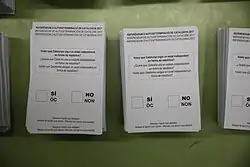 Im Juni 2017 wurde das Referendum dann zunächst im katalanischen Parlament, anschließend dann auf einer Großkundgebung in Barcelona für den 1. Oktober 2017 formell angekündigt, und zwar unabhängig davon, ob das spanische Verfassungsgericht es erlaubt oder nicht.[13][14] Als Frageformulierung des Referendums wurde „Wollen Sie, dass Katalonien ein unabhängiger Staat in Form einer Republik ist?“ gewählt. Der geplante Stimmzettel enthält diese Frage in katalanischer, spanischer und okzitanischer Sprache; letzteres, weil Okzitanisch in seinem aranesischen Dialekt Amtssprache im Val d’Aran mit einigen tausend Einwohnern ist.