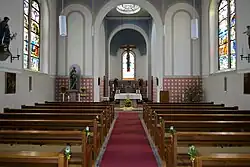 Die Kirche wurde 1874 im Stil der Neoromanik fertiggestellt. Ein Teil ihres Turmes aus Sandstein stammt aus dem Jahre 1325, während das Kirchenschiff aus Kalkstein erbaut wurde. Im Innern befinden sich ein um das Jahr 1300 angefertigter Taufstein aus Sandstein sowie mehrere Fenster von 1908, die das Leben der Gottesmutter darstellen. Sie ist ebenfalls auf dem Chorfenster von 1874 abgebildet.