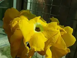 Die gelben Blüten besitzen einen braunrot gefärbten Schlund. Die Kronröhre ist unterhalb des Saums nur wenig gekrümmt, so dass der Saum an älteren Blüten fast senkrecht steht.