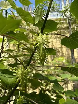 Die seitlich stark zusammengedrückte Frucht ist in der Seitenansicht eiförmig und mit einem langen, schmalen, länglichen Schnabel versehen. An den 5 Zentimeter langen und 3 Zentimeter breiten Früchten werden zwei verschiedene Stachelformen ausgebildet. Die bis 15 Millimeter langen Hakenstacheln stehen etwa zu fünft in einer Reihe, wobei sie nicht über den Schnabel hinaus gehen. Die stark verbreiterten Basen der Stacheln bilden einen bis 5 Millimeter hohen Kamm aus. Die zahlreichen einfachen Stacheln sind etwa bis 3 Millimeter lang und oft unterentwickelt. Es werden keine falschen Scheidewände ausgebildet. Die verkehrt eiförmig-dreieckigen Samen werden 8 Millimeter lang und 8 Millimeter breit. Die mit breiten Flügeln versehene Samen wird 1,5 Millimeter groß.