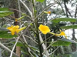 Der Blütenstand besteht aus Cymen mit 1 bis 3 Einzelblüten, die keine Büschel ausbilden. Die goldgelben Blüten besitzen einen dunkelroten Schlund. Die Blütenröhre wird etwa 4,5 Zentimeter lang.