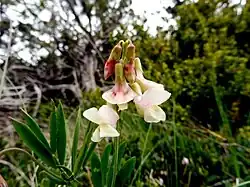 Die Ungarische Platterbse wächst in feuchten bis trockenen Magerwiesen und lichten Gebüschen.