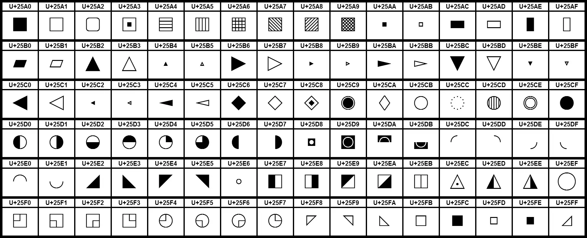 Der Unicodeblock Geometrische Formen (engl. Geometric Shapes, U+25A0 bis U+25FF) enthält verschiedene geometrische Figuren, zum Beispiel Quadrate, Kreise oder Dreiecke.