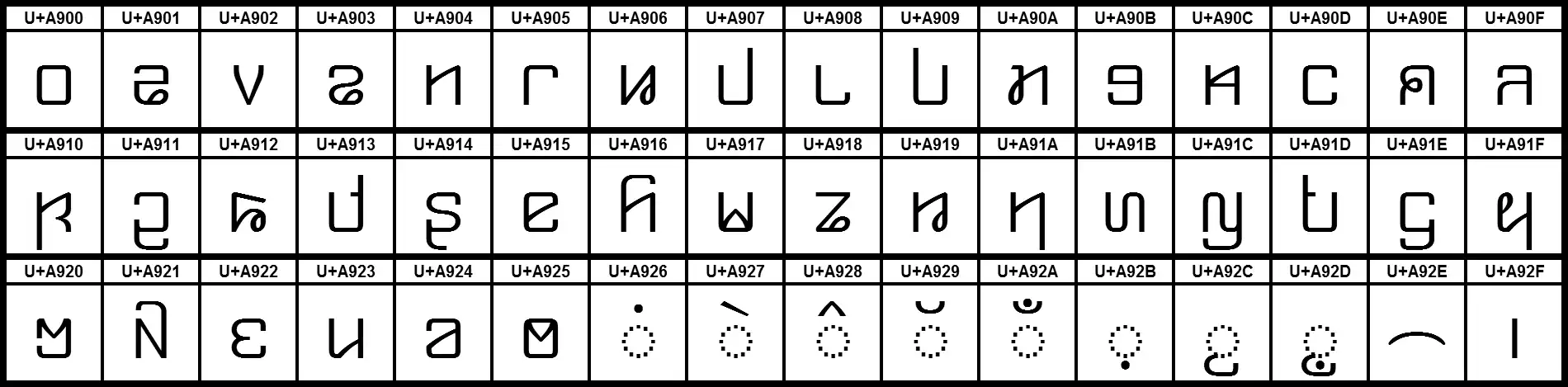 | U+A915 (43285) | ꤕ | anderer Buchstabe, Silbe oder Ideogramm | links nach rechts | KAYAH LI LETTER PA | Kayah-Li-Buchstabe Pa |