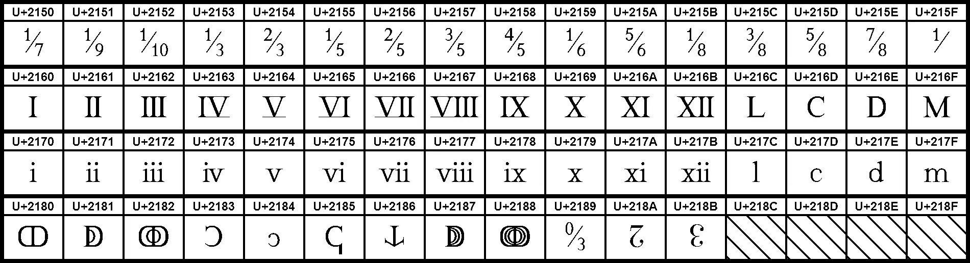 Der zweite Teil enthält Römische Zahlen, die zwar größtenteils aus lateinischen Buchstaben bestehen, hier aber zu einem Zeichen zusammengefasst werden und wodurch auch die Möglichkeit eröffnet wird, sie von diesen grafisch zu unterscheiden (z. B. durch durchgezogene Linien über und unter der römischen Zahl, wie man dies handschriftlich oft tut). Vor allem aber eignen sich diese Zeichen zur Darstellung in ostasiatischen Texten, insbesondere bei vertikaler Schreibrichtung.