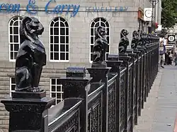 Die Brüstung besteht aus gusseisernen Pfeilern und eingehängten ornamentierten Feldern. Die Pfeiler sind abwechselnd mit Leopardenplastiken ornamentiert.[1] Sie wurden von William Wilson geschaffen und 1910, nach Beendigung der Erweiterung, installiert.[4]