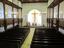 Die hölzerne Empore im Innenraum entstammt der Konzeption Max Schmechels. Hanns Markus Heinlein schnitzte 1949 das sieben Meter hohe Kruzifix. Von ihm stammen auch die Figuren der zwölf Apostel, die 1951 an den Emporen rechts und links angebracht wurden, und der Opferstock. Die Kirchenfenster gestaltete 1951 der Mannheimer Künstler Karl Rödel. Die Paramente wurden 2005 beschafft.[2]