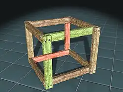 Die Erfahrung sagt dem Betrachter, dass sowohl die obere vordere Querlatte wie auch die senkrechte Latte links im Vordergrund (in der 2. Abbildung grün) aufgrund der perspektivischen Gesetze optisch vor den anderen Latten liegen muss. Dennoch sieht der Betrachter vermeintlich, dass die senkrechte Latte rechts hinten und die querliegende hinten unten (rot) diese beiden überlagern, was aber unmöglich ist.