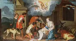 - Die Geburt Jesu zeigt das zwölfte Bild. Unbekleidet, in einen Trog gebettet, liegt das neugeborene Kind am Boden. Die Eltern stehen zu beiden Seiten, drei kleine Engel zwischen ihnen betrachten das Jesukindlein in anbetendem Staunen. Über die niedrige Brüstung, die den Raum nach hinten abschließt und den Blick in eine nächtliche Hügellandschaft frei lässt, schauen zwei Hirten herein, ein dritter weilt, von der Erscheinung des Engels gefesselt, bei seiner Herde. Durch eine Maueröffnung strecken Ochs und Esel ihre Köpfe herein.
