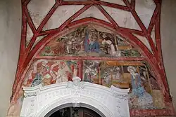 Der Aufgang zur alten Empore in der Vorhalle war früher ebenfalls bebildert. Hier waren allerdings die Fresken so beschädigt, dass sie größtenteils nicht wiederhergestellt werden konnten.