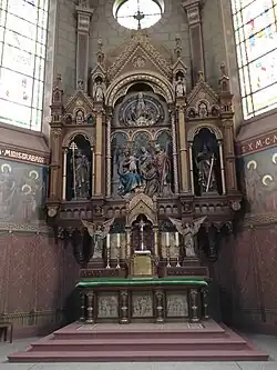 Der Hochaltar wird durch eine Figurengruppe passend zum Patrozinium Maria, unsere liebe Frau vom Berg Karmel geprägt. Sie zeigt Maria mit dem Christusknaben, der dem hl. Simon Stock ein Skapulier überreicht. Hinter dieser Szene stehen die Karmelitin Theresa von Avila und Bischof Remigius als Patron von St. Remigius, der ältesten Kirche der Baar. Das Hauptbild wird überragt von einem in den Kirchenraum blickenden, mit Tiara bekrönten Gottvater. Links und rechts stehen Figuren der Mitpatrone der einstigen Liebfrauenkirche, der Apostelfürsten Petrus und Paulus. Im Altartisch sind drei Reliefs eingelassen, die das Opfer des Melchisedech, Mose mit der Schlange und die Bindung Isaaks zeigen.