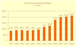 In diesem Zusammenhang blieben die unfreiwillige Teilzeitbeschäftigung aus dem Mikrozensus unberücksichtigt. Von unfreiwilliger Teilzeitbeschäftigung spricht man, wenn die Befragten als Grund für ihre Teilzeittätigkeit angeben, keine Vollzeitbeschäftigung gefunden zu haben. Für sie ist Teilzeitarbeit in der Regel das kleinere Übel, um nicht in die Arbeitslosigkeit abzurutschen.