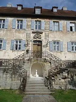 Zu dem Schloss führt vom Vorplatz auf der Westseite aus eine aus Naturstein errichtete, zweiläufige Freitreppe mit schmiedeeisernen Geländern.[12] Über der Eingangstür, zu der die Freitreppe führt, befindet sich das Allianzwappen der Eheleute Wilhelm Christian Friedrich von Seefried und dessen Ehefrau Elisabeth Sofie von Stiebar.[13]