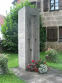 Das Denkmal vor der Kirche wurde am 7. August 1921 eingeweiht. In dem Zeitungsbericht darüber wird auch die ursprüngliche Form beschrieben: „Auf zwei Stufen steht eine massive viereckige Säule in die die Namen der Gefallenen eingemeiselt sind, darauf liegt ein Stahlhelm, unter dem ein Eichenlaubkranz hervorschaut, beide aus dem gleichen Stein nachgebildet.“[12] Das Denkmal wurde 1959 grundlegend umgestaltet. Der Helm wurde entfernt, die eingemeißelten Namen wurden überputzt. Dann wurde die Säule kopfüber (mit dem neu eingemeißelten Christusbild) wieder aufgestellt. An den Seiten wurden die Namen der Gefallenen des Ersten und des Zweiten Weltkriegs in Bleibuchstaben angebracht. In der Marienkirche befindet sich noch eine Tafel aus Eichenholz mit 15 Porzellanbildern der Gefallenen des Ersten Weltkrieges. Am Volkstrauertag findet jedes Jahr eine Gedenkfeier an dem Denkmal statt.