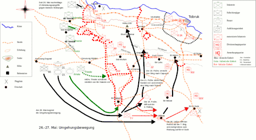 Nach der Einnahme Bir Hakeims ließ Rommel seine Truppen erneut nach Osten und Norden vorstoßen. Bis zum 13. Juni wurden die alliierten Verbände in der so genannten „Knightsbridge Box“ sowie bei El Adem zurückgedrängt. Damit stand den Achsenmächte sowohl der Weg in Richtung Tobruk als auch die Möglichkeit offen, dem alliierten XIII. Korps, das immer noch in unentschiedenen Kämpfen mit den italienischen Divisionen vor Gazala verwickelt war, in den Rücken zu fallen.