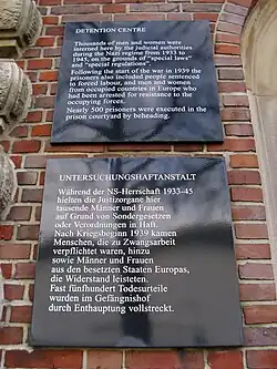 Neben dem Eingang zur Haftanstalt am Holstenglacis und auch an der Rückseite des Geländes, an einer Mauer in den Kleinen Wallanlagen, erinnern Gedenktafeln und Stolpersteine an die Opfer, zum einen allgemein und im Speziellen an die Lübecker Märtyrer sowie an Suzanne Masson und France Bloch-Sérazin, zwei Frauen aus der französischen Résistance, die ebenfalls 1943 dort hingerichtet wurden. Am 15. Dezember 1944 fanden die letzten drei Hinrichtungen im Untersuchungsgefängnis statt. Danach wurde die Guillotine in die Strafanstalt Bützow-Dreibergen gebracht; sie war dort bis zum Kriegsende im Einsatz.[4]