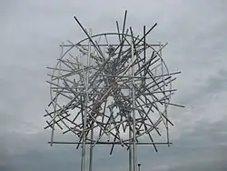 Zwischen den vier Pfosten spannen sich über eine Breite von sechs Metern ein Quadrat und ein kreisrunder Reifen, beide aus Rohren gefertigt. Dazwischen tut sich ein schier endloses Gewirr von kleineren und größeren Rohren auf, wie alle anderen Rohre aus Aluminium und 5 cm dick. Nur wenn man längere Zeit hinsieht, wie bei einem Vexierspiel, erkennt man die Figur eines Menschen, dessen Gliedmaßen ähnlich wie beim Turnen mit einem Rhönrad zur Seite ausgreifen und sich an dem Reifen abstützen. Man fühlt sich an die populäre Zeichnung Leonardo da Vincis mit dem sogenannten vitruvianischen Menschen erinnert, die das Proportionsschema der menschlichen Gestalt nach der Theorie des römischen Architekten Vitruv darstellt.