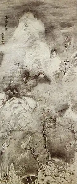 - ↑ Zwei Bergspitzen über Wolken (双峰挿雲図, Sōhō sōun-zu) im Idemitsu-Kunstmuseum.