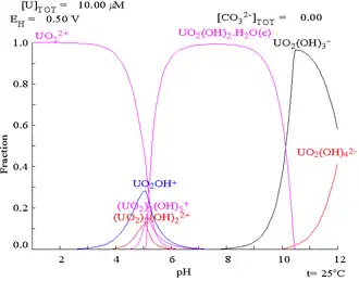 Mit ansteigendem pH-Wert bilden sich vermehrt polymere Ionen mit der Stöchiometrie [(UO2)2(OH)2]2+ und [(UO2)3(OH)5]+, bevor Uranylhydroxid [UO2(OH)2] ausfällt.[18]