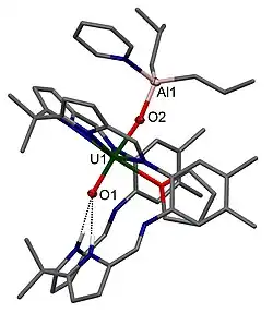 Die synthetische Darstellung von Uranyl(V)-Komplexen war daher lange Zeit nicht möglich. Im Jahre 2003 gelang es jedoch, die erste Uranyl(V)-Verbindung darzustellen und röntgenkristallographisch zu untersuchen. Berthet et al. synthetisierten durch Zufall das Kation [UO2(OPPh3)4]+ (Ph = Phenyl) in Form des Triflat-Salzes.[26] Das Uranyl(V)-Ion unterscheidet sich zum Uranyl(VI) durch seine längeren U–O-Bindungen, sowie eine höhere Lewis-Basizität der Uranyl-Sauerstoffatome, bedingt durch die geringere Ladungsdichte am Uranatom.[15] Seine Elektronenkonfiguration lautet daher [Rn] 5f1, d. h., es besitzt ein einzelnes f-Elektron und ist daher paramagnetisch.[1] Seither sind verschiedene Ligandsysteme erprobt worden, in denen gezielt, unter Ausschluss von Luftsauerstoff und Feuchtigkeit, eine Darstellung von Uranyl(V)-Komplexen erfolgen kann. Die erhöhte Basizität der Uranyl-Sauerstoffatome führt schließlich häufig zur Koordination von Heteroatomen, so zum Beispiel in einem polymeren Uranyl(V)-Komplex {[UO2py5][KI2py2]}n (py = Pyridin), dessen äquatoriale Ebene von Pyridin-Liganden und dessen Uranyl-Sauerstoffatome von K+-Ionen koordiniert werden.[27] In ähnlicher Weise kann die Einelektronenreduktion von Uranyl(VI)-Pacman-Komplexen mit Hilfe von Diisobutylaluminiumhydrid durchgeführt werden, so dass ein Uranyl(V)-Aluminium(III)-Komplex entsteht, in dem das Aluminiumatom direkt an den Uranyl-Sauerstoff gebunden ist.[28]