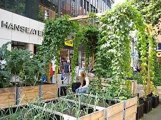 - Durch lokale Nahrungsmittelherstellung und ortsnahen Konsum können Transportwege (und somit der Ausstoß von Kohlendioxid) verringert werden.[3] Insbesondere durch den Einsatz von Gewächshäusern können die Erträge auf begrenzten Anbauflächen optimiert und Energie eingespart werden.[4]