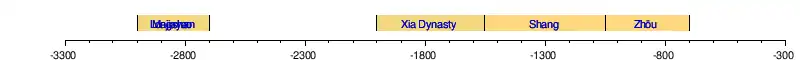 Das Volk der Yangshao, das zwischen 5000 und 2500 v. Chr. existierte, waren Bauern, die in charakteristischen Behausungen lebten, die teilweise unter der Erde lagen. Ihre Keramik enthielt Entwürfe, die möglicherweise Symbole waren, die sich später zur Schriftsprache entwickelten. Ihre Dörfer lagen im westlichen Henan, im südwestlichen Shanxi und im zentralen Shaanxi. Zwischen 2500 und 1000 v. Chr. existierte die Longshan-Kultur im Süden, Osten und Nordosten Chinas und bis in die Mandschurei hinein. Sie verfügten über bessere Ackerbau- und Keramikherstellungstechniken als das Volk der Yangshao, hatten rituelle Bestattungspraktiken und beteten ihre Vorfahren an.[29] Zu den nachfolgenden Dynastien gehören die Xia-, Shang und Zhou-Dynastien. Auch entwickelte sich die Altchinesische Sprache in dieser Zeit.[31]