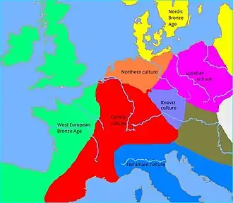 | Rotgefärbte Fläche Verbreitungsgebiet der Urnenfelderkultur; Süddeutschland, Schweiz, Ost- und teilw. Südfrankreich, Katalonien, Oberitalien, Slowenien, Tschechien, westliche Donauländer | |