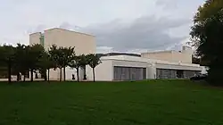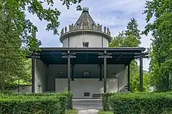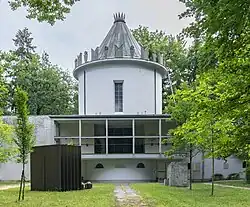 Schulte-Gebäude mit der zweiarmigen Freitreppe in der von Holzpfeilern getragenen offenen Vorhalle. Über die Anlage erhebt sich der Zeremoniensaal, welcher in seinen äußeren Formen als Rundturm mit Zinnenkranz und Kegeldach konzipiert wurde.