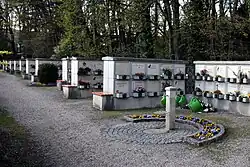Gedenktafeln für Verstorbene mit Sozialbestattung im Ehren- oder Bürgermeisterhof. Das Kolumbarium mit ihren Urnen befindet sich direkt dahinter im Inneren des Schulte-Gebäudes.
