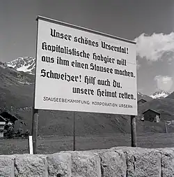 Da die ganze Talgemeinschaft vom Kraftwerksbau betroffen gewesen wäre und eine Umsiedlung nicht als Ganzes hätte umgesetzt werden können, regte sich massiver Widerstand der Talbevölkerung gegen den Verlust von Heimat und Gemeinschaft. Der Widerstand wurde von Ludwig Danioth, dem damaligen Verwalter der Korporation Urseren und Regierungsrat des Kantons Uri koordiniert.[12] Die Losung des Widerstandes hiess: Wir verhandeln nicht, wir verkaufen nicht, wir geben nicht ! Die CKW als Bauherrin des Projektes argumentierte für das Projekt, indem sie auf ein gesamtschweizerisches Interesse hinwies, das über regionale und kantonale Interessen zu setzen sei.[13]