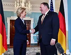 Ursula von der Leyen ist eine enge Freundin der Altbundeskanzlerin Angela Merkel, mit der sie regelmäßig telefonischen Kontakt hält. Diese vertraute Beziehung, die über viele Jahre hinweg gewachsen ist, entwickelte sich während ihrer langjährigen gemeinsamen politischen Laufbahn. Von der Leyen diente 14 Jahre lang unter ihrer Kanzlerschaft in drei Ministerämtern. Merkel schlug von der Leyen 2019 der EU als neue Vorsitzende der Europäischen Kommission vor (siehe unten); sie wurde gewählt und zog nach Brüssel.[11][12]