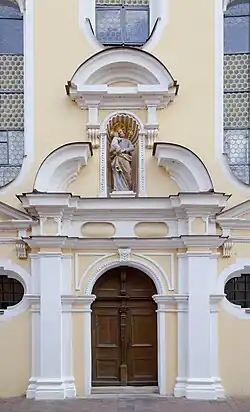 Die Westfassade zur Neustadt hin bildet die Sichtseite der Kirche. Auffällig ist in erster Linie die für die Entstehungszeit ungewöhnliche Gestaltung, die im Hauptteil ohne Gliederung durch Pilaster und Gesimse auskommt. Ein Charakteristikum sind dagegen die drei hohen, barocken Fenster, die oben und unten im leicht eingezogenen Rundbogen schließen. Das mittlere Fenster ist aufgrund seiner Lage über dem Portal höher als die beiden äußeren angesetzt. Der kleine, angedeutete Dreiecksgiebel über dem Fenster fügt sich in die mit Triglyphen geschmückte Giebelbasis ein. Über den beiden äußeren Fenstern ist Platz für Überdachungen in Form von rundbogigen, tympanonartigen Giebeln, die auf Volutenkonsolen ruhen. Das rundbogige Portal wird von zwei toskanischen Pilastern flankiert und von zwei Giebelstücken bekrönt, zwischen denen in eine rundbogige Muschelnische eine Figur des Kirchenpatrons Joseph eingestellt ist. Die Nische wird von einem rundbogigen Giebel auf Volutenkonsolen überragt. Die querovalen Fenster zu beiden Seiten des Portals sind von Dreiecksgiebeln bekrönt, die wiederum auf Volutenkonsolen ruhen. Oberhalb des von drei weiteren querovalen Fenstern durchbrochenen Dreiecksgiebels erhebt sich auf dem First ein gemauerter Dachreiter, der auf allen vier Seiten rundbogige Schallöffnungen besitzt. Die gefasten Kanten sind mit toskanischen Pilastern verziert. Den oberen Abschluss bildet eine Zwiebelkuppel.[2]