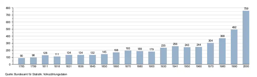 - ↑ a b Daten der Eidgenössischen Volkszählungen ab 1850 nach Gemeinden. (XLSX; 10 MB) Bundesamt für Statistik, Neuchâtel, 12. Juli 2024, abgerufen am 18. September 2025 (Öffnung in Excel nur über "Anhang/Excel-Datensatz" möglich).