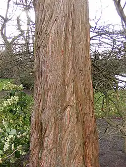 Die Rinde der Zweige ist anfangs grün, wird aber im zweiten und dritten Jahr grau bis grau-braun. Der Stamm von Jungbäumen besitzt eine rot-braune Borke, die in dünnen Platten abblättert. Die Stämme von älteren Bäumen besitzen eine graue bis grau-braune Borke, die sich in langen Streifen ablöst und dabei die darunterliegende rotbraune innere Rinde freilegt.