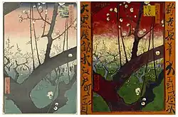 Links: Hiroshige, „Garten der Pflaumenbäume in Kameido“