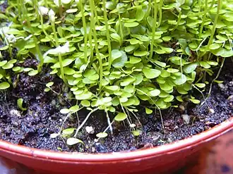 Aus den Stolonen wachsen die hellgrünen, löffelförmigen, rundgerandeten Laubblätter, die eine Breite von 1 bis 6 Millimeter und eine Länge von bis zu 15 mm erreichen können. Die Pflanze bildet mit ihren Blättern ganzjährig einen dichten grünen Rasen von einer Höhe von 3 bis 6 Millimeter.