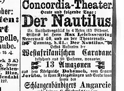 - ↑ Rea Brändle: „Wilde, die sich hier sehen lassen“. Jahrmarkt, frühe Völkerschauen und Schaustellerei. Zürich 2023, S. 171, und Im Zoologischen Garten …. In: Rhein- und Ruhrzeitung, 12. August 1891, S. 2.